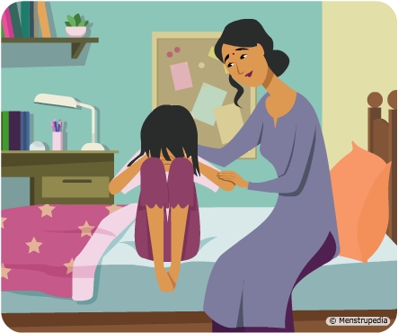 Ask her about her concerns or fears, how it happened, or anything else she may want to let you know. Allow her to share whether she is experiencing pains, irritation or mood swings. Find solutions to minor discomforts by offering her food or water, hot water bag for pains, ice-cream for upliftment, etc. Listening to her lets her know that you are approachable and are there to fulfil her needs. It will also remove any sense of nervousness that she might be going through.